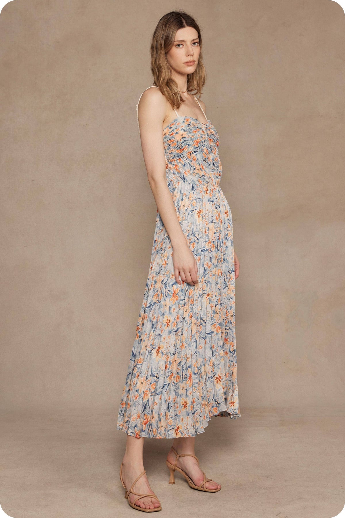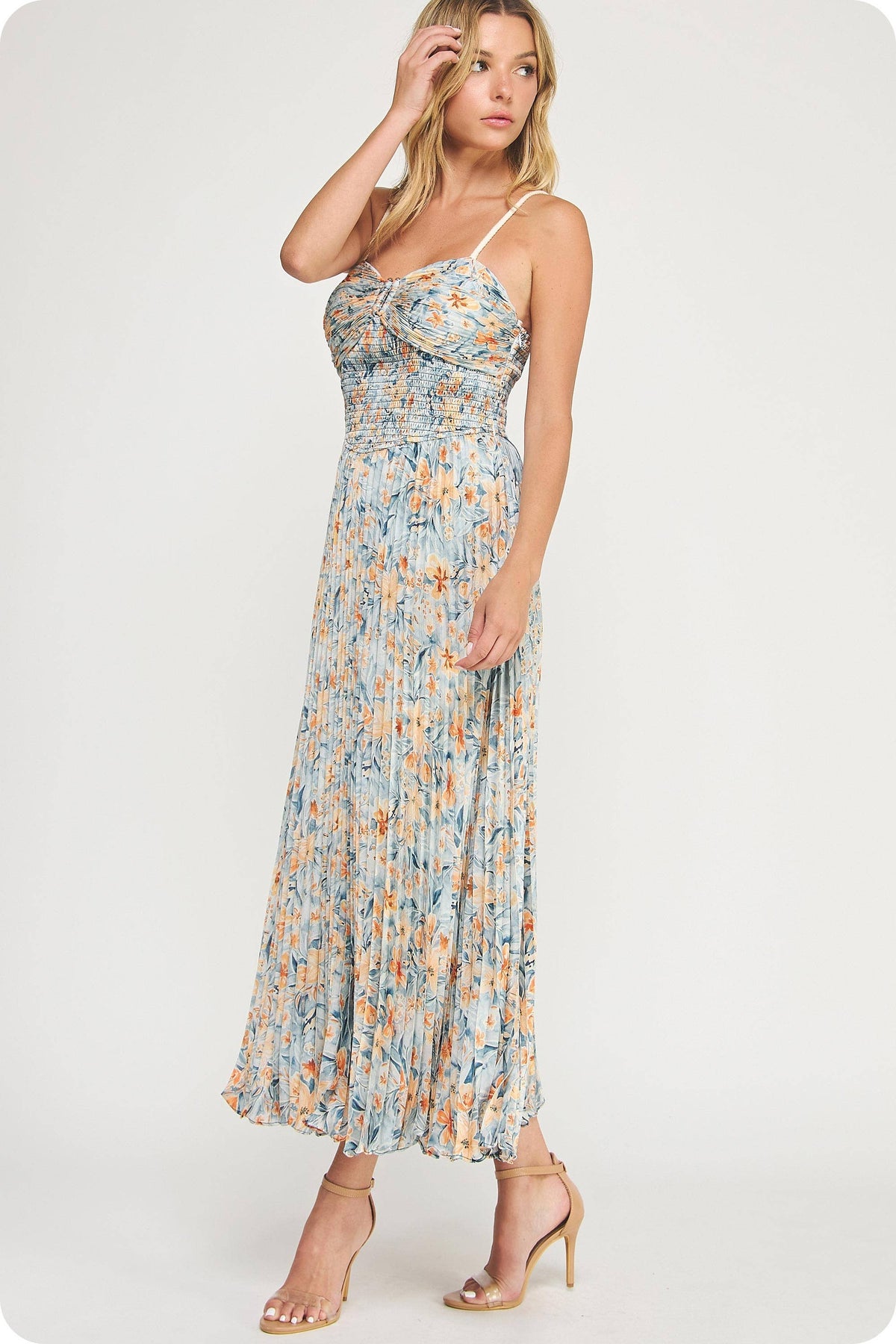 Studio Strut and Bolt Collection. Sweetheart pleated midi dress in an exclusive floral print on satin fabric. This long dress features all over pleated fabrication, a sweetheart neckline with wired peekaboo detail, braided adjustable straps, elasticated smocked waist/back bodice, and lining.