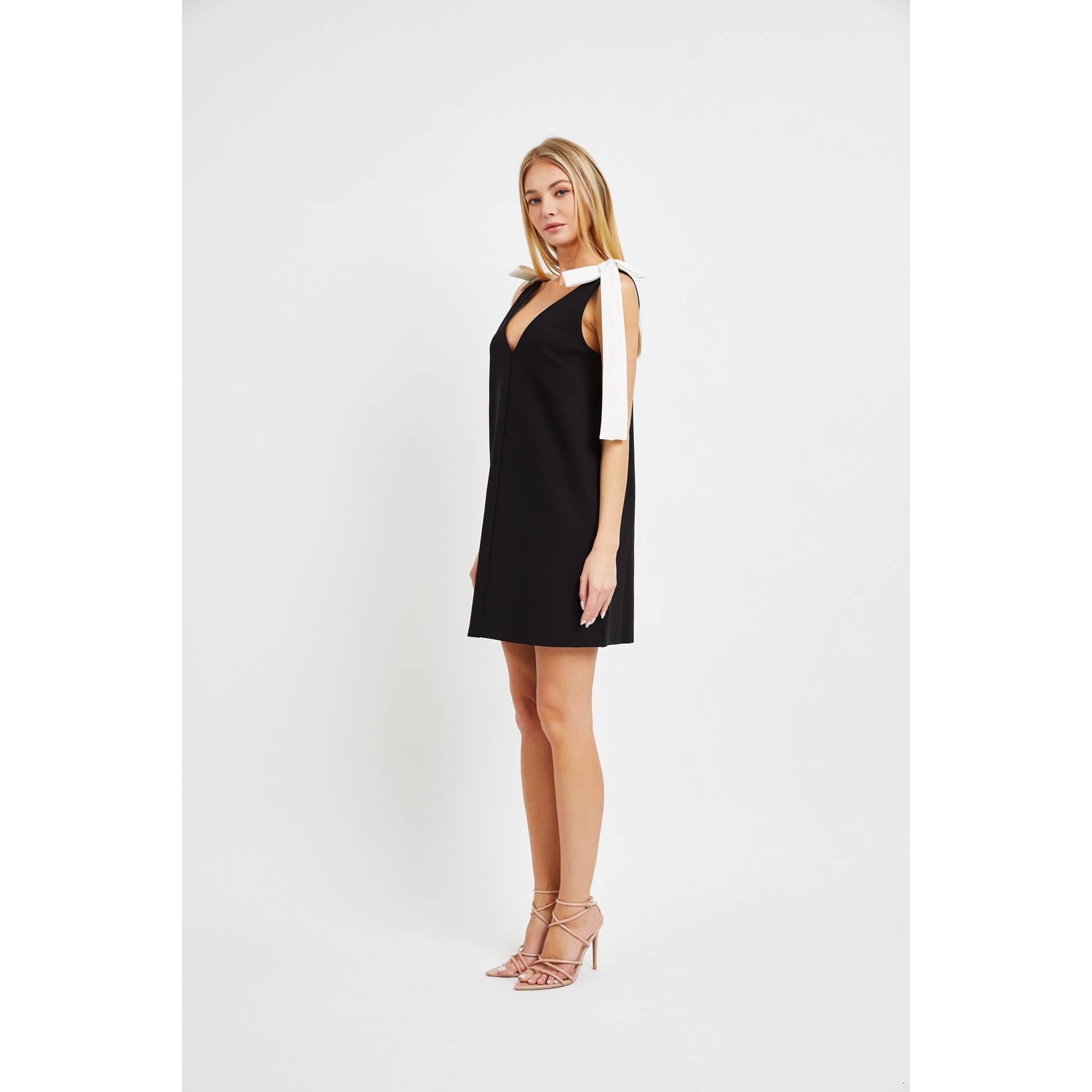 CONTRAST SHOULDER BOW DETAIL V-NECK MINI DRESS