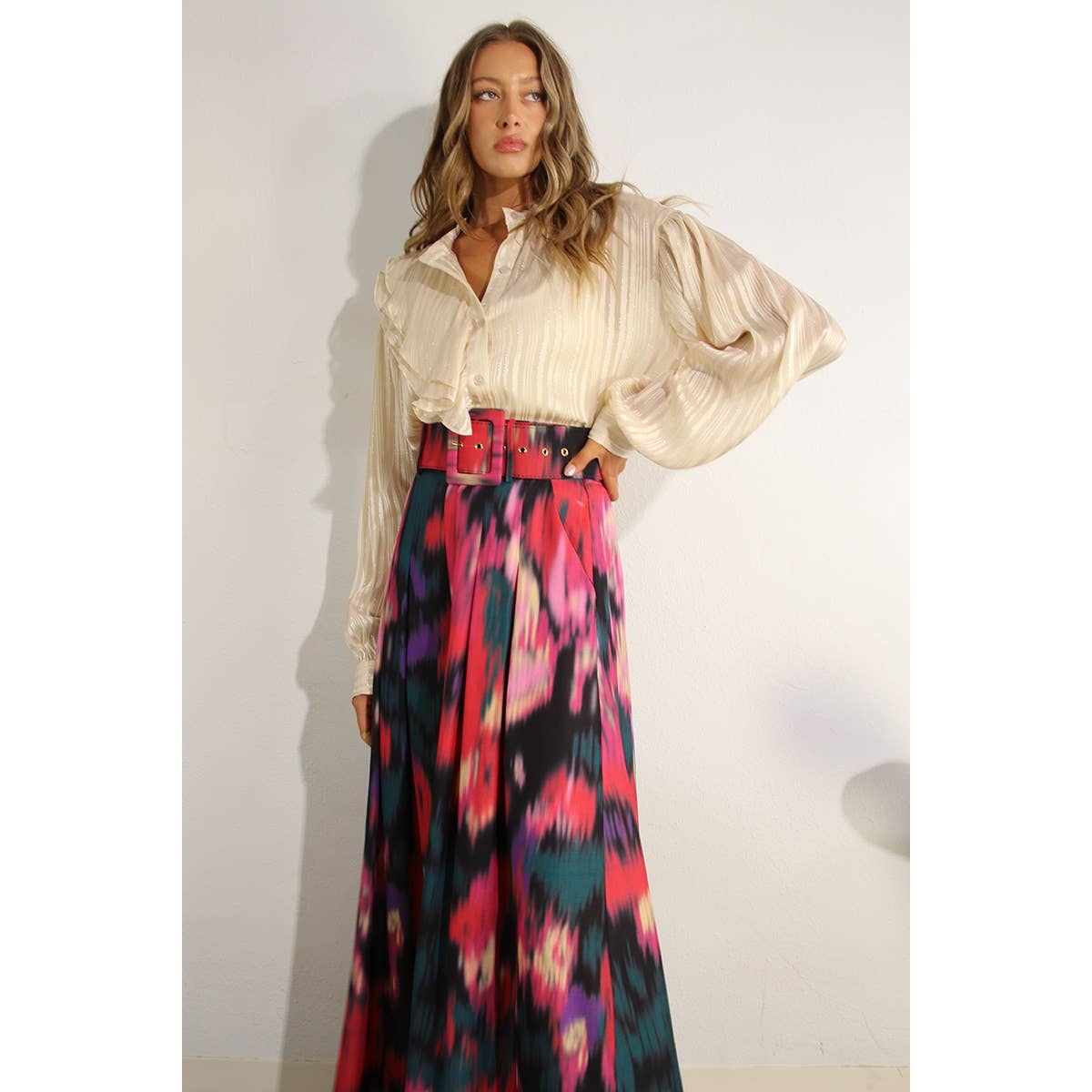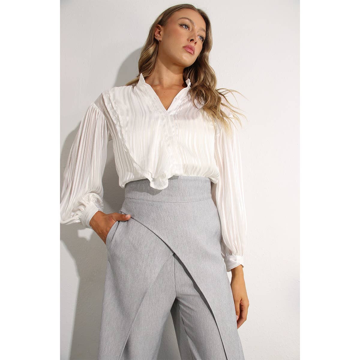 - Style No: MST2279-3-2 RUFFLE BLOUSE Material and Care: Polyester, Cold hand wash with same colors. Our lovely Ceca is US size 2 with the following measurements: height:5'9' bust:32 waist:24 hips:34 She wears size Small.