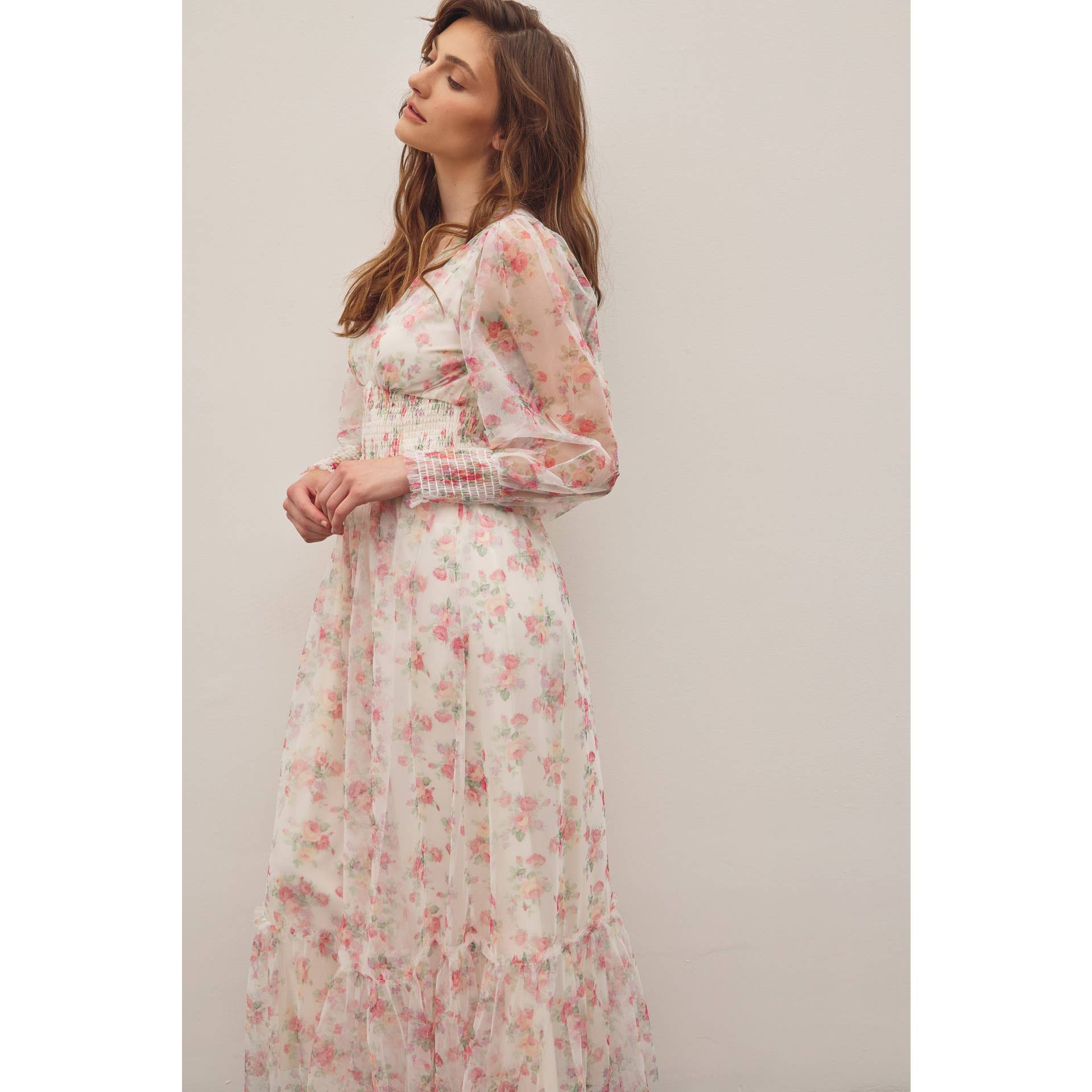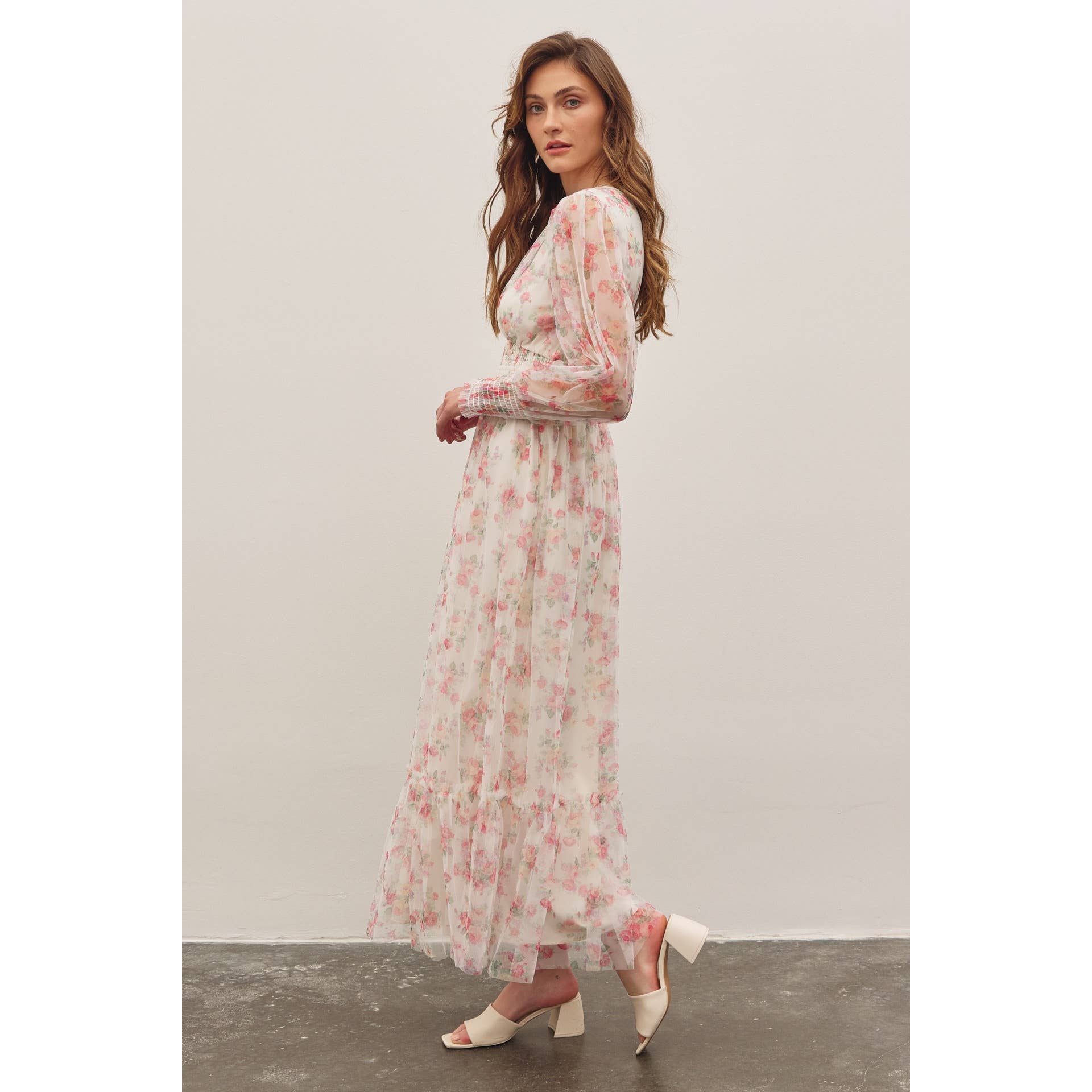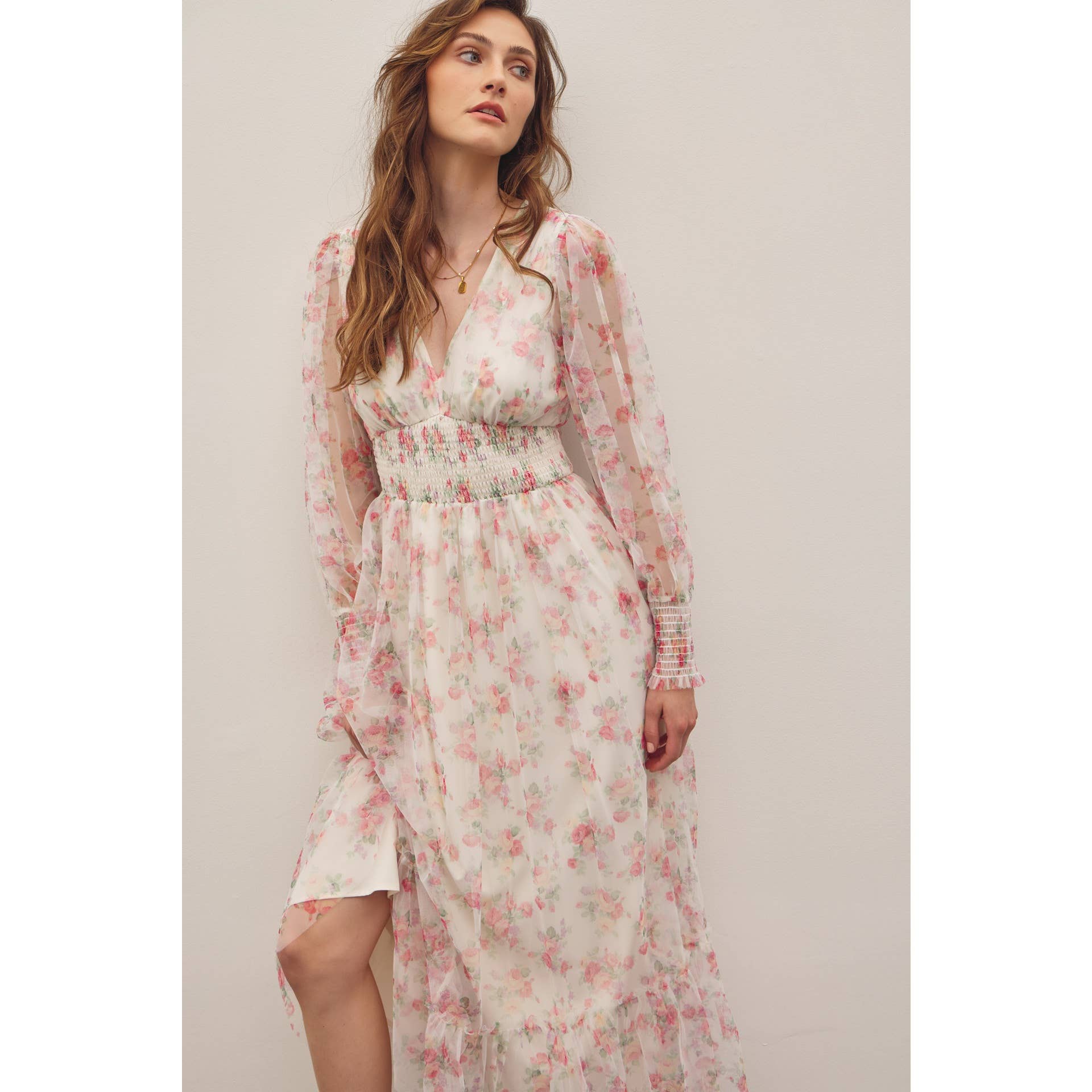 Romantic and ethereal, this sweet maxi dress is featured in a sheer mesh fabrication with floral prints, smocked paneling at the bodice, long sleeves, ruffled details, and full lining.