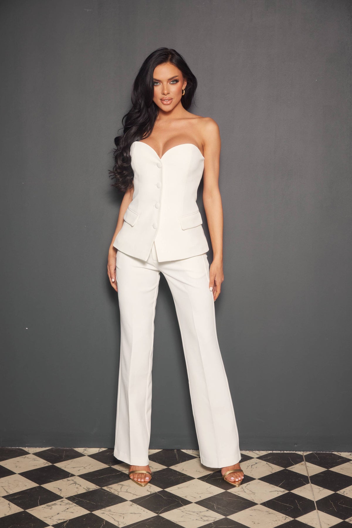 Elevate your style with our tailored corset and pant set! This chic two-piece set features a stylish corset vest with covered buttons and a flattering fit, paired with high-quality pants with back pocket details. The fabric hugs your curves, enhancing your best features. Whether you're heading to the office, a dinner, or closing a deal, this set will make you feel confident and ready to take on the world. Available in white and trendy burgundy, sizes S, M, and L, with spandex for the perfect fit.